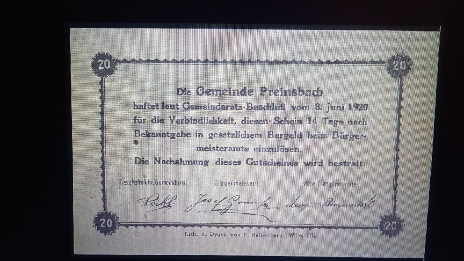 Im Zuge seiner Recherche über die Freiwillige Feuerwehr Preinsbach, die heuer im August ihr 100-jähriges Bestandsjubiläum feiert, entdeckte Peter Greßl, Bezirkssachbearbeiter für Feuerwehrgeschichte, Notgeld der damaligen Gemeinde Preinsbach – der Ort wurde 1972 Teil der Großgemeinde Amstetten. Möglicherweise wurde damit auch das Feuerwehrdepot in Preinsbach mitfinanziert. Weiters fand der fleißige Bezirkssachbearbeiter auch Original-Zeitungsberichte, die über die ersten Einsätze der FF Preinsbach berichteten.